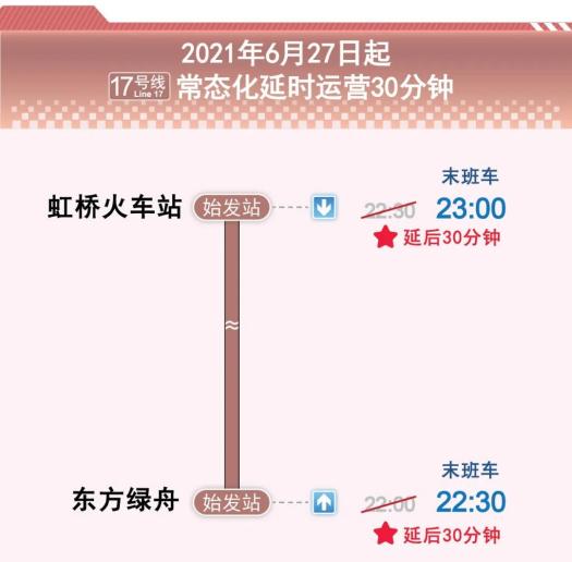 17号线常态化延时运营实施后,每天将为乘客提供更长时间的运营服务。其中,东方绿舟往虹桥火车站方向的末班车发车时间由22:00调整为22:30,虹桥火车站往东方绿舟方向的末班车发车时间由22:30调整为23:00,提请市民乘客注意并合理规划安排出行时间。