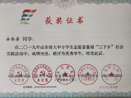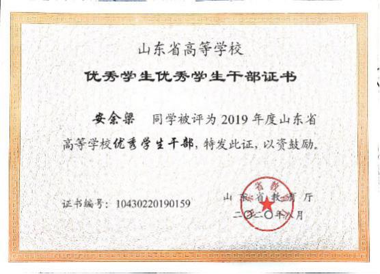 如果说大学教会了我们什么?安余梁会说,是坚定的理想信念,使自己在奋斗征程中激发精神力量。在先后组织开展的50余次团课、青马班培训、团日活动中,他练就了强烈的政治敏锐性和大局观;在学校第五次团代会代表发言上,他结合自身经历阐述学生团员政治理论学习的必要性,时刻用时政思想武装头脑。2020年获评“山东省优秀学生干部”,连续两年获学校“优秀团员”“优秀团干部”“优秀学生干部”荣誉称号。