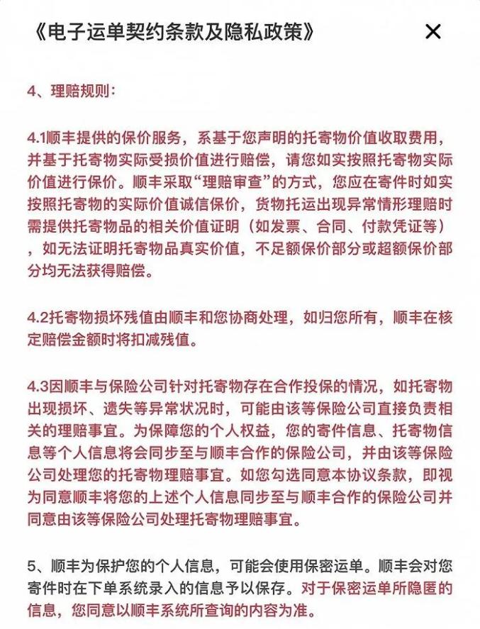 在下单之前,消费者需勾选《电子运单契约条款及隐私政策》的理赔规则。此外,价值不易核实的物品、易损或不易妥善包装的物品,如古玩字画、纪念币、翡翠原石、木雕、观赏石等,均不提供保价服务。