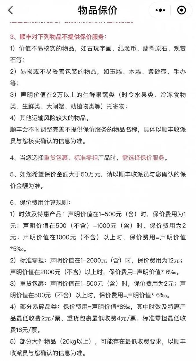 顺丰制定的物品保价规则。王先生对界面新闻记者表示,他不认可顺丰的处理,理赔金额应由双方商定。同时,他要求顺丰说明这批货物运输过程中究竟出现了什么问题,并就此事进行公开道歉。界面新闻记者多次尝试联系顺丰向阳速运集配站负责人及负责配送的快递员,但截止发稿前,电话始终未能接通。顺丰公共事务部方面也表示,目前对此事暂无回应。