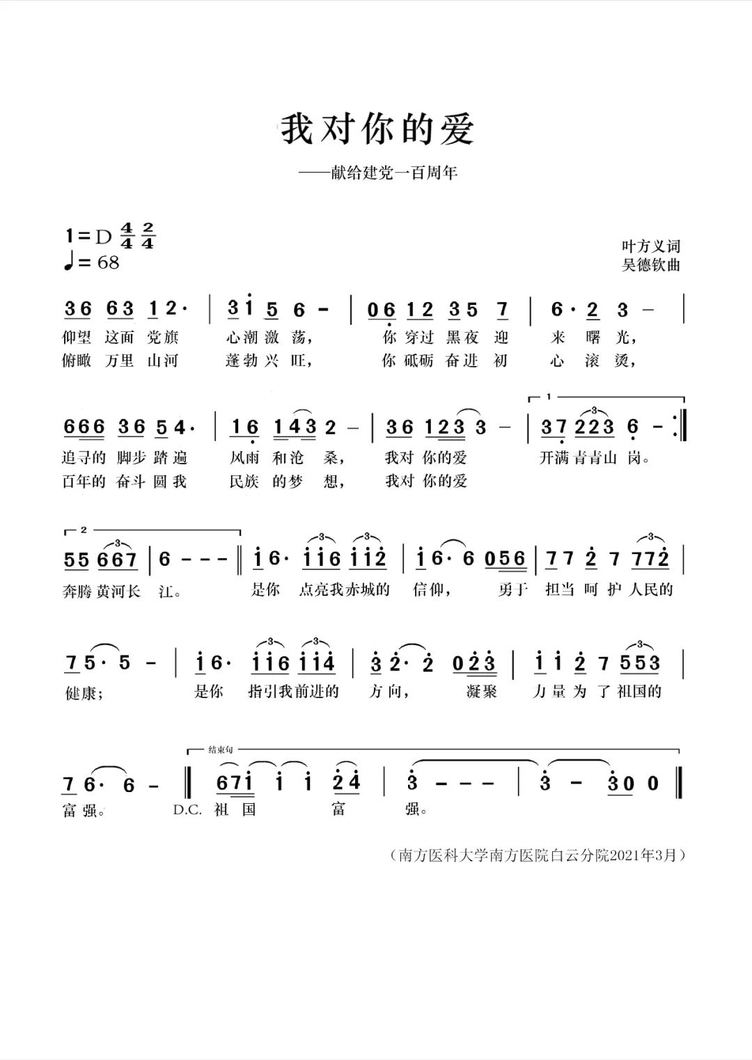 南方医科大学南方医院白云分院为庆祝中国共产党成立100周年,组织创作了《我对你的爱》这首歌曲。歌曲通过回顾中国共产党波澜壮阔的奋斗岁月,展望复兴崛起的未来征程,更加坚定了全体医务工作者,集合在党旗下、永远跟党走的豪迈信念,同时,也体现了医院医护人员在抗击新冠肺炎疫情中的责任,体现了医护人员守护人民健康的担当。