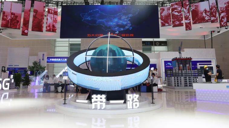 现场设置了25块悬空吊装屏幕、“一带一路”版块球状环形LED屏,以投影、视频轮播的形式展示中建八局经营业绩、科技成果、经典工程、铁军文化等内容,悬空吊装扩大了展厅内容可视范围。
