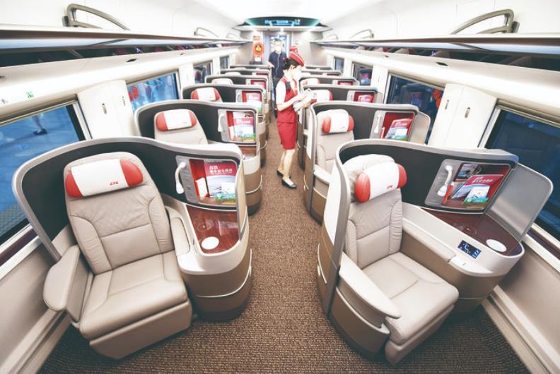 列车创新设置开放式餐吧区,并增设“静音车厢”功能,广播音量可降为普通车厢的30%。29英寸宽屏显示器可分屏同时显示列车运行和娱乐节目信息;列车的空调机组采用变频技术,不仅实现节能10%,噪音更小,还可根据车内外环境自动调节温度。