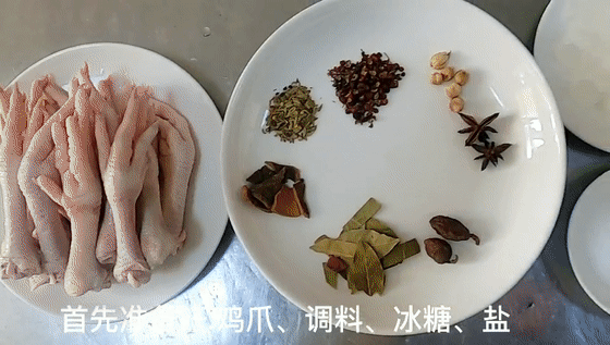 准备好鸡爪。调料:冰糖,盐,干辣椒,味精,葱段,姜片,料酒,老抽,耗油。
