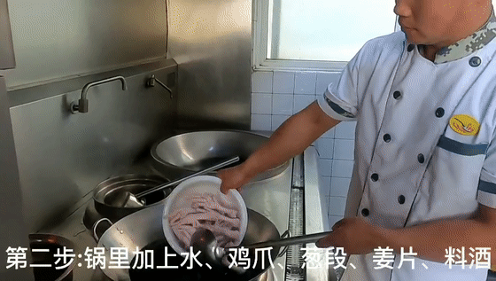 锅里加上凉水,鸡爪,姜片,葱段,料酒。水煮开时去掉血沫,再煮俩分钟,捞出用凉水过凉控干水分备用。