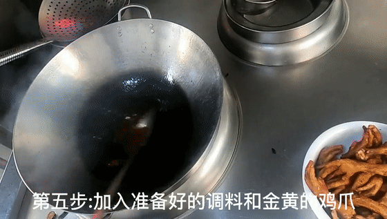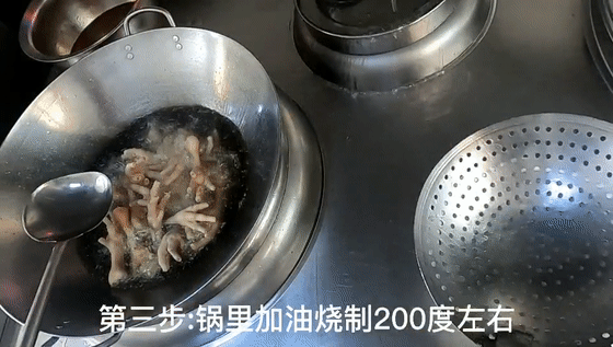 锅里加油烧制200℃左右,加入鸡爪炸制金黄捞出备用。在炸制过程中可用炒勺轻轻搅拌,防止鸡爪粘连。