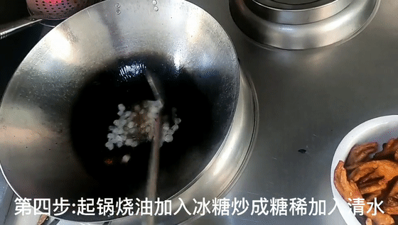 起锅加油加入冰糖小火炒制,由冰糖变成糖稀,再炒制糖稀变成酱红色冒大泡变小泡加入清水。