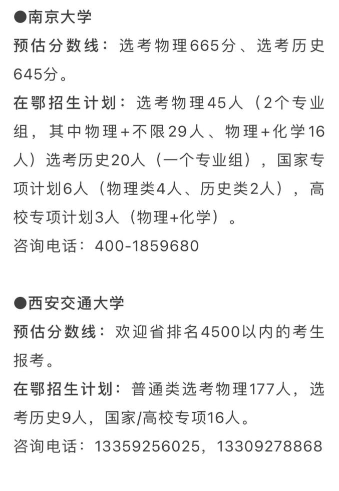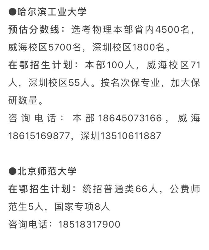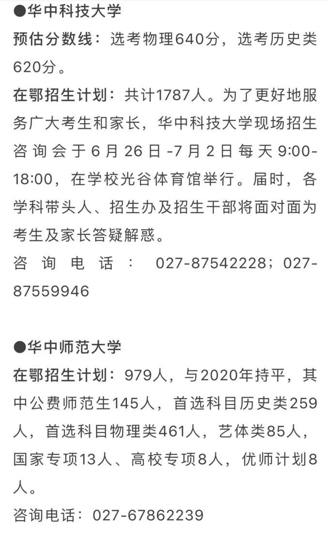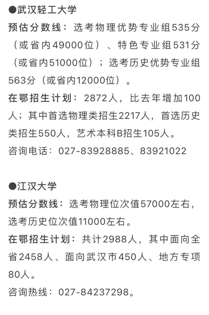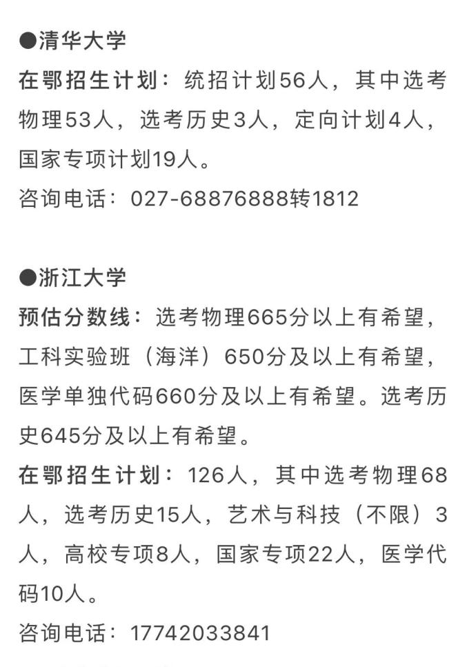 在鄂招生计划:1662人(不含强基计划、高水平艺术团、高水平运动队、保送生等特殊类型招生)。武汉大学招生咨询电话从今日到7月2日从早8点到晚8点为广大考生家长开通,关注“武大招办”微信公众号或登录武大本科招生网http://aoff.whu.edu.cn第一时间获得招生信息及招生宣传老师联系方式。
