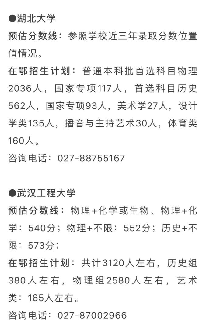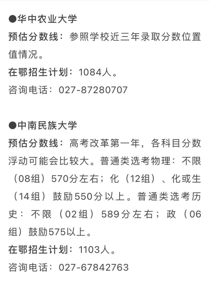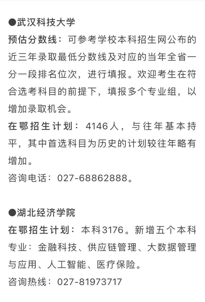 在鄂招生计划:2335人,在鄂招生规模最大的教育部直属院校。新增网络与新媒体、储能科学与工程、机器人工程、大数据管理与应用4个新文科、新工科专业,大部分专业实施大类招生。