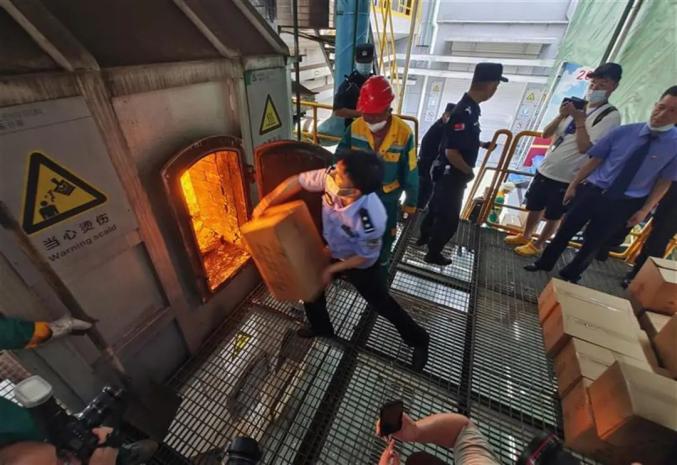 6月24日,武汉市禁毒委在园博园长江文明馆举行毒品公开销毁暨禁毒先进授牌仪式。图为民籍将一箱毒品送进销毁锅炉。