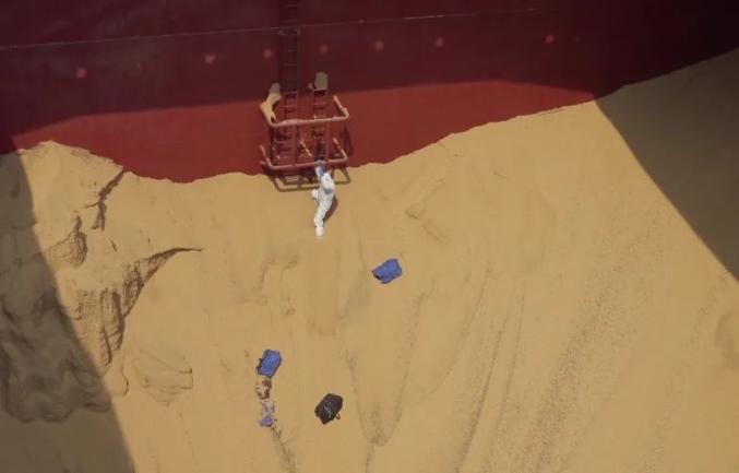 近日,山东省查获近年来数量最大的可卡因走私案。图为海关缉私警察在进口大豆货舱内发现走私毒品 。