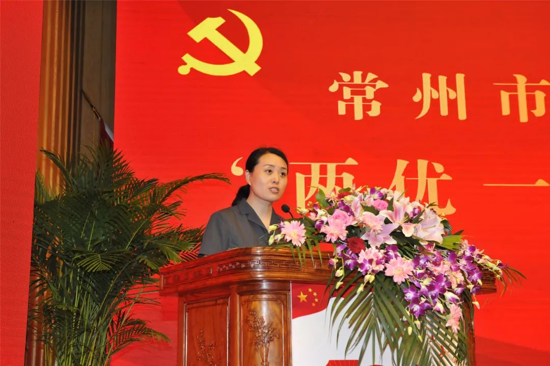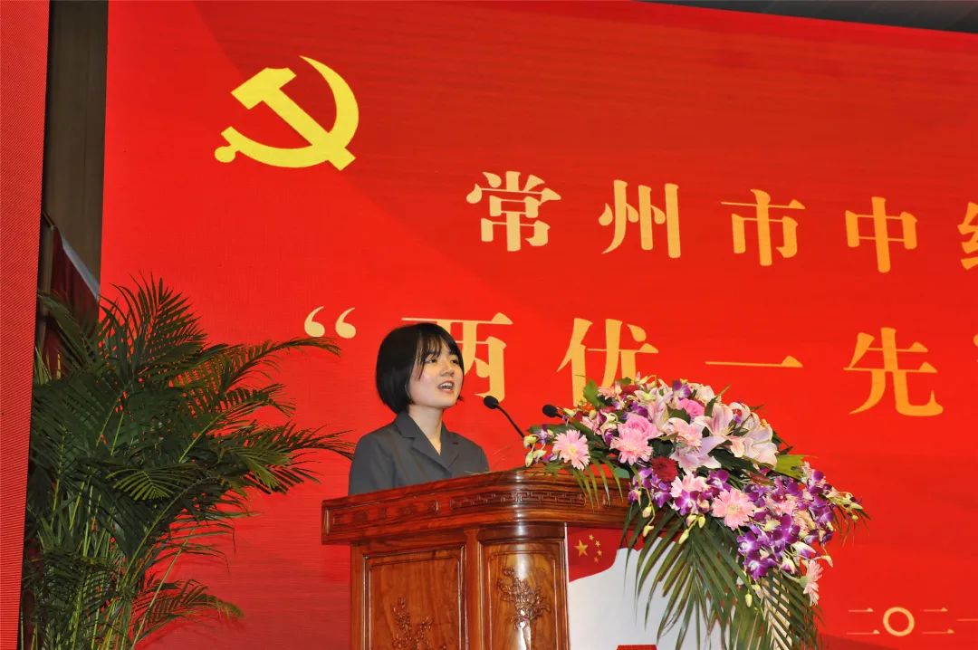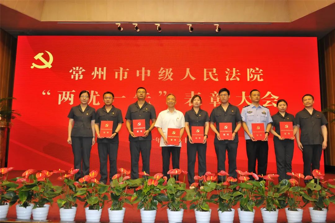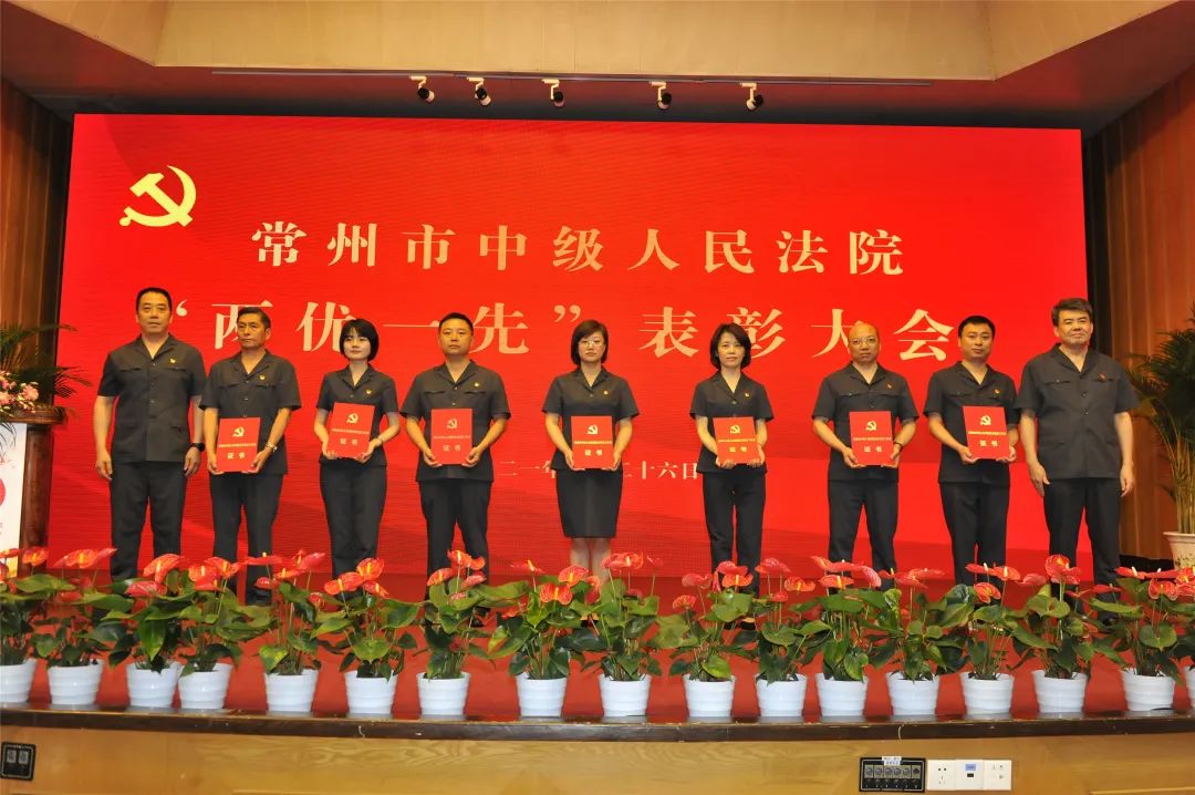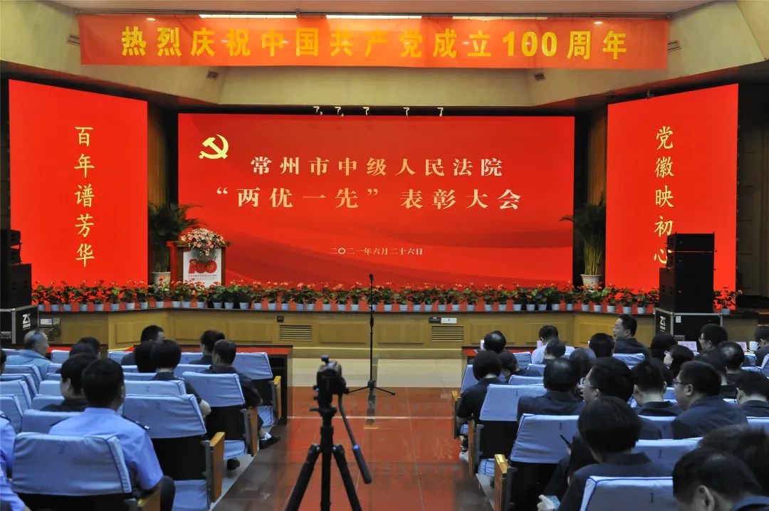 会场气氛庄重热烈,主席台上方悬挂着“热烈庆祝中国共产党成立100周年”的大幅标语,台上大型电子屏上显示着“常州市中级人民法院‘两优一先’表彰大会”的醒目会标,两个侧屏上分别写着“党徽映初心”和“ 百年谱芳华”的标语。