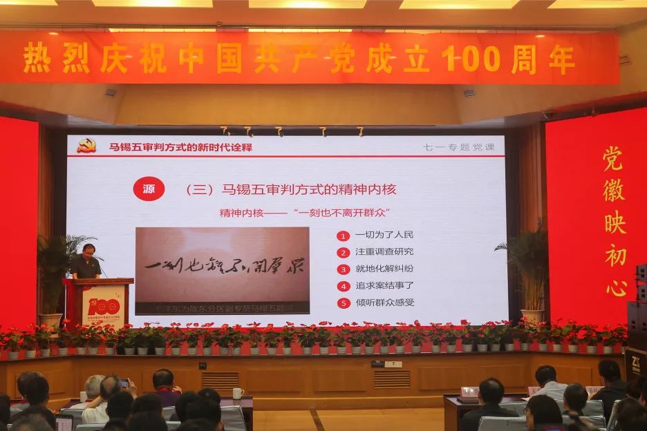 马荣院长以《传承红色法治基因,践行司法为民初心》为题,围绕马锡五审判方式的形成之源、传承发扬马锡五审判方式的新时代需求、新时代马锡五审判方式的实现路径三个方面,为全体党员干警讲授了一堂兼具理论性和实践性的生动党课。