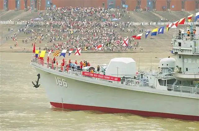166舰是我国自行研制的051型第二代导弹驱逐舰,舰身长130余米,排水量3600多吨,航速32节,于1987年10月31日在大连造船厂开建,1991年11月21日完工交付南海舰队服役。