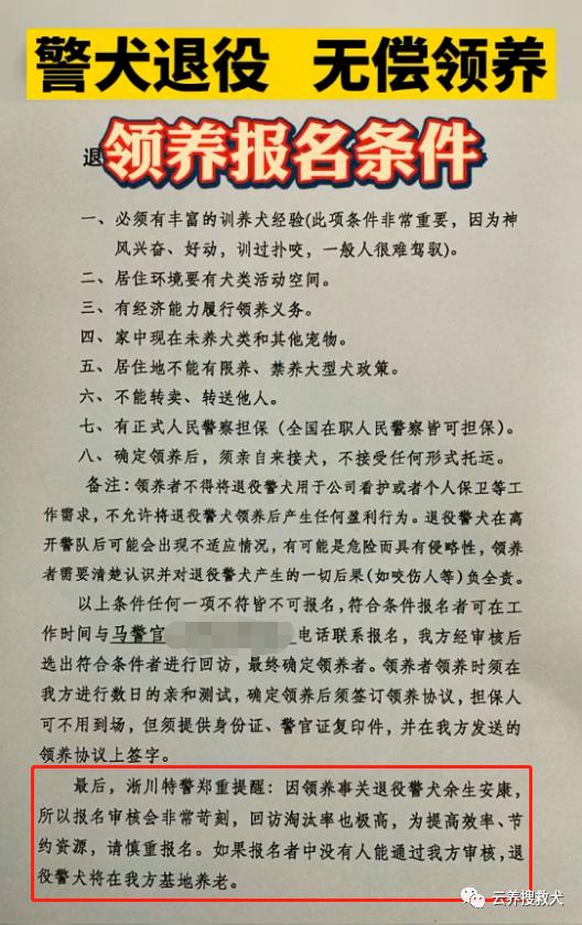 在一张退役警犬领养书上,红星新闻记者看到,河南省淅川县退役的警犬“神风”曾在网上公开寻找领养。其中对于领养者的要求是:有养犬训犬经验且家庭未养犬;有经济能力(家中有单独院子);居住地不能限养德牧;不能转卖,或送给他人;有正式的人民警察给予担保;领养后,必须亲自来接犬。