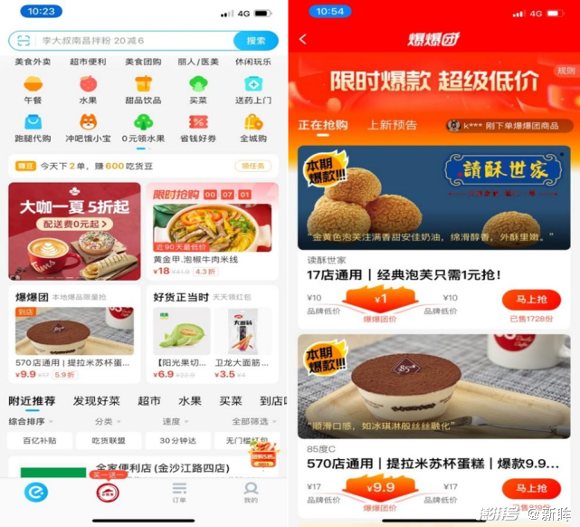 根据Tech星球报道,今年5月,饿了么率先在深圳和苏州两城测试了“爆爆团”业务,并在首屏广告位设置了入口。“爆爆团”相当于线下版的聚划算,是一款主打稀缺、超性价比的爆品团购产品,和其他本地团购平台的购买流程一样,用户在爆爆团抢购完商品后,需到线下门店核销交易。