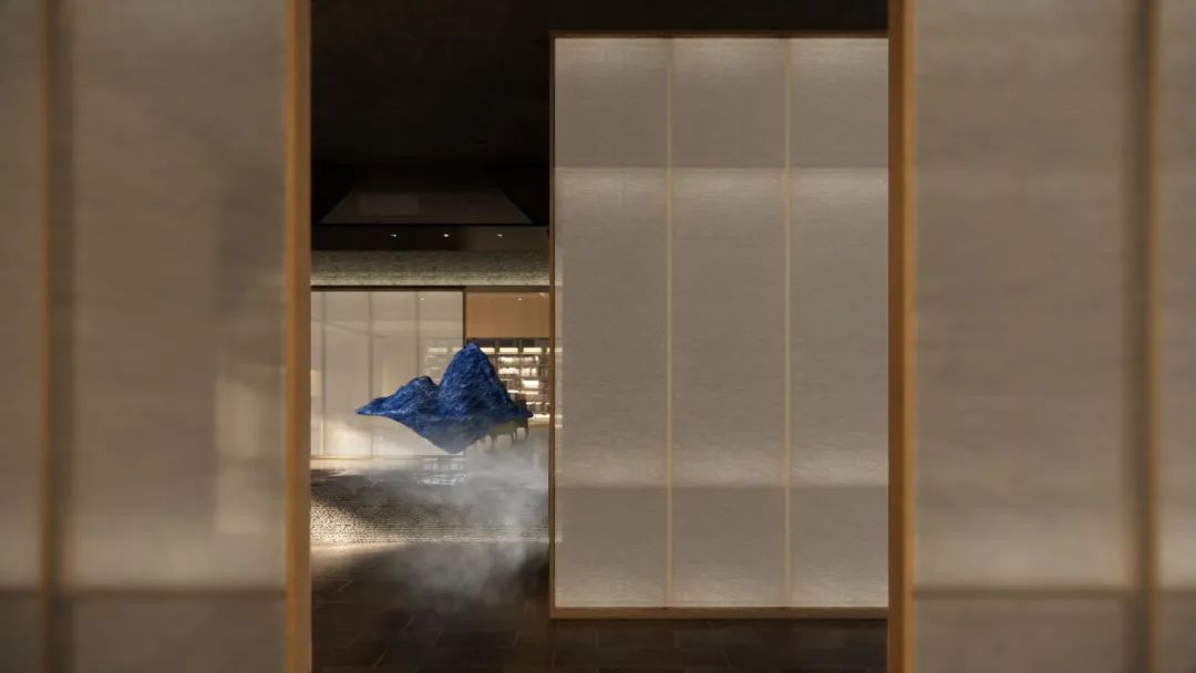 每一个空间独立而又相互联系,缂丝的隔断与榫卯结构的书架墙构成的空间宛如当代的江南宅院。地面采用传统大漆金砖,和宣纸墙面一起进一步强调了人文气质,配以雾气使在其中行走的人们犹如漂浮云中。