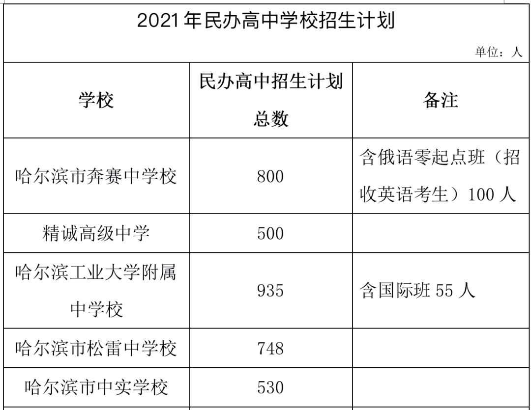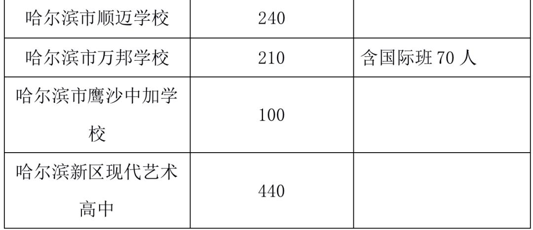松雷中学计划招生748人,比去年增加89人;中实学校计划招生748人,比去年增加90人;万邦学校计划招生210人,比去年增加30人;精诚高级中学计划招生500人,比去年增加200人。此外,今年新增哈尔滨新区现代艺术高中计划招生440人。