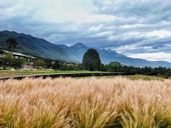在丽江白沙村边,物与岚•设计收藏酒店多处景观就地取材,与雪山密林融为一体。其中,落云自然体验中心便采用了当地的贵峰红石材和香格里拉地区回收的老屋顶盖板,正是对传统工艺和在地材料现代化演绎。