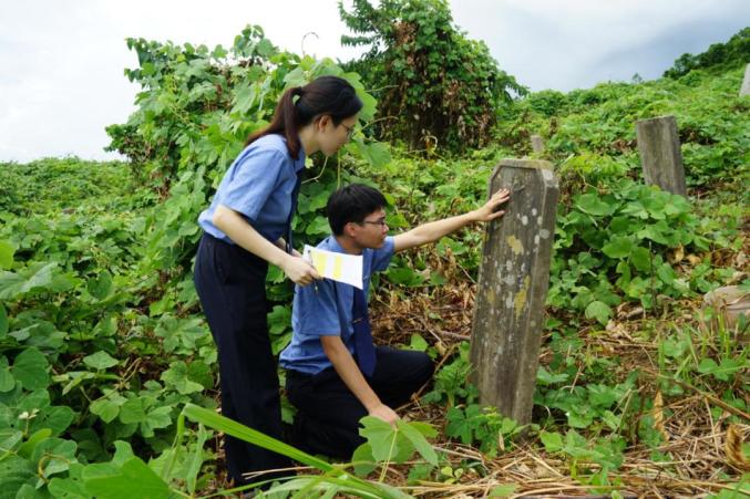 检察人员在辨认烈士墓碑并核对烈士信息。
