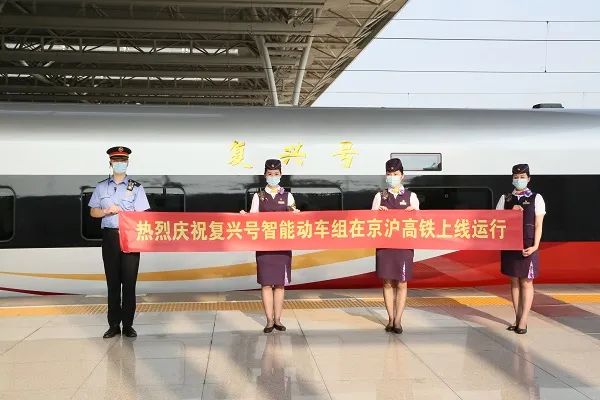 乘务员拉横幅庆祝复兴号智能动车组在京沪高铁上线运行 姚佳 摄