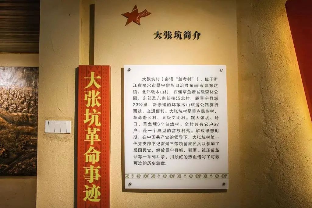 大张坑畲族革命历史展览馆陈列了景宁畲族革命简史、忠勇精神由来、大张坑革命事迹、忠勇烈士魂等一系列畲族革命事迹,展示了革命战争年代畲族人民舍生取义的英雄气概,以及一代代畲家人传承“忠勇精神”和奋力奔向美好生活的自强自立故事。