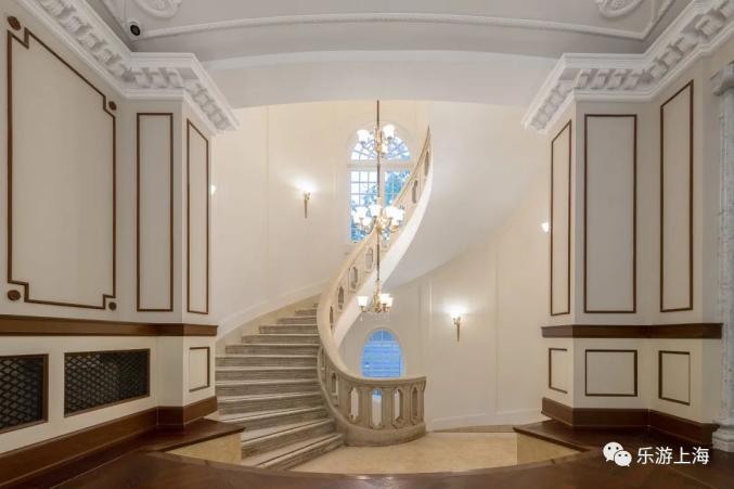 弧形水磨石旋转大楼梯,是汾阳路150号内饰中最具特色的设计之一,自由流畅的乳白色水磨石扶手和镂空栏板,同色系的水磨石踏步兼金属防滑条。