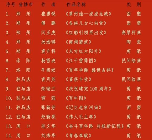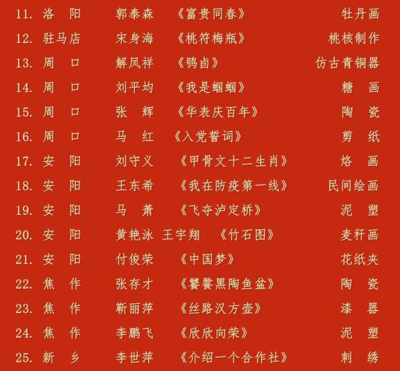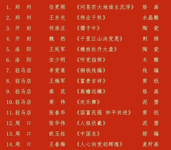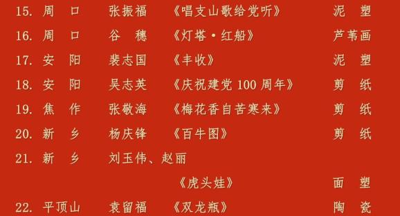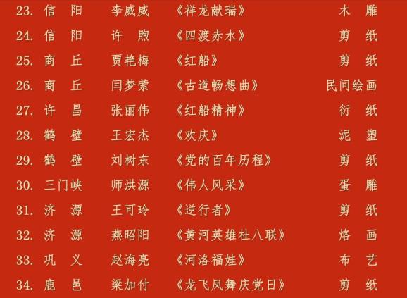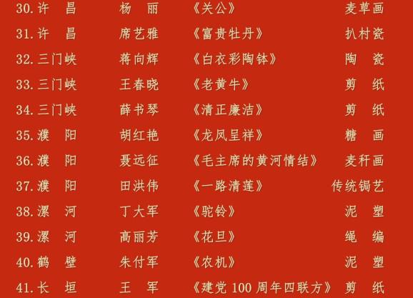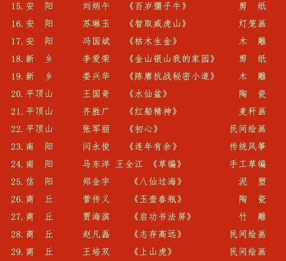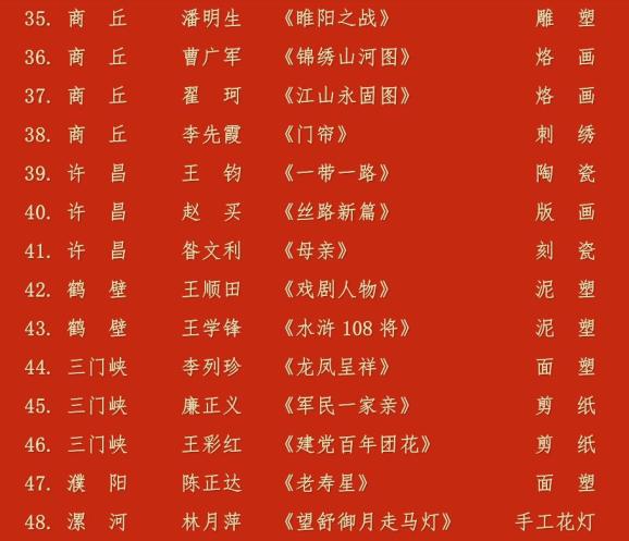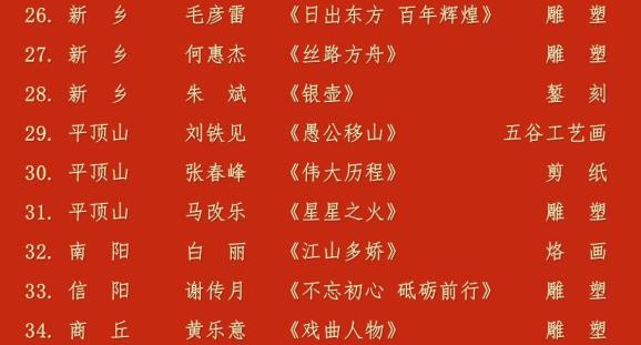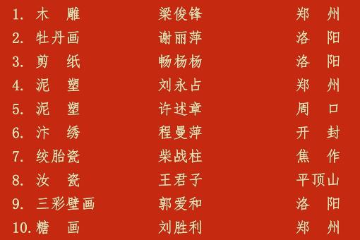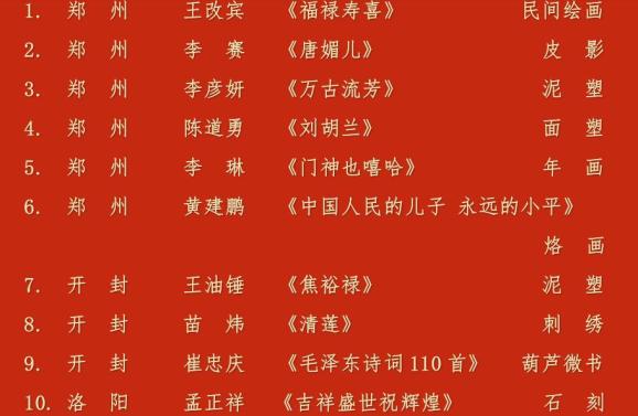 本着公平公正公开的原则,秉承黄河文化开放大气、多样包容的理念,主办方组织全省民间艺术研究、创作及相关领域专家对参赛作品进行了严格评审,共评选出10名河南省民间艺术高手,34个一等奖作品,54个二等奖作品,41个三等奖作品。现将获奖作品名单公布如下。