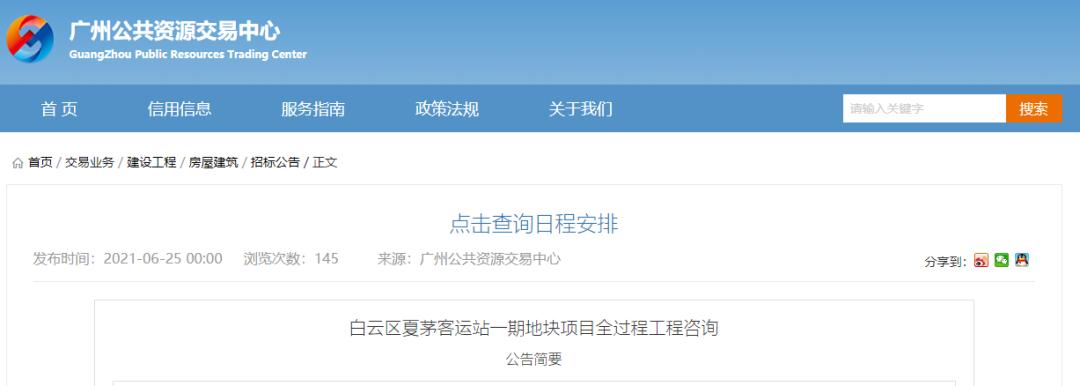 6月25日,广州市公共资源交易中心发布《白云区夏茅客运站一期地块项目全过程工程咨询》招标公告。