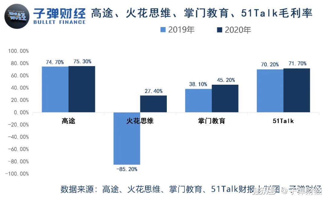 根据上述几家机构的招股书或财报,过去两年,主打在线大班课的高途毛利率一直位于74%以上,既高于同期主打在线小班课的火花思维毛利率,也高于同期主打在线一对一的掌门教育和51Talk的毛利率。