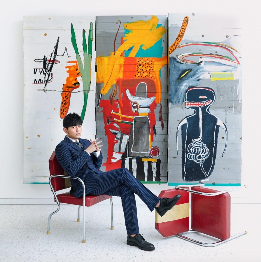 这次,周杰伦把照片中巴斯奎特曾坐过的椅子,连同画作一同带到拍卖会预展现场,摆出了相同的pose,表示致敬。