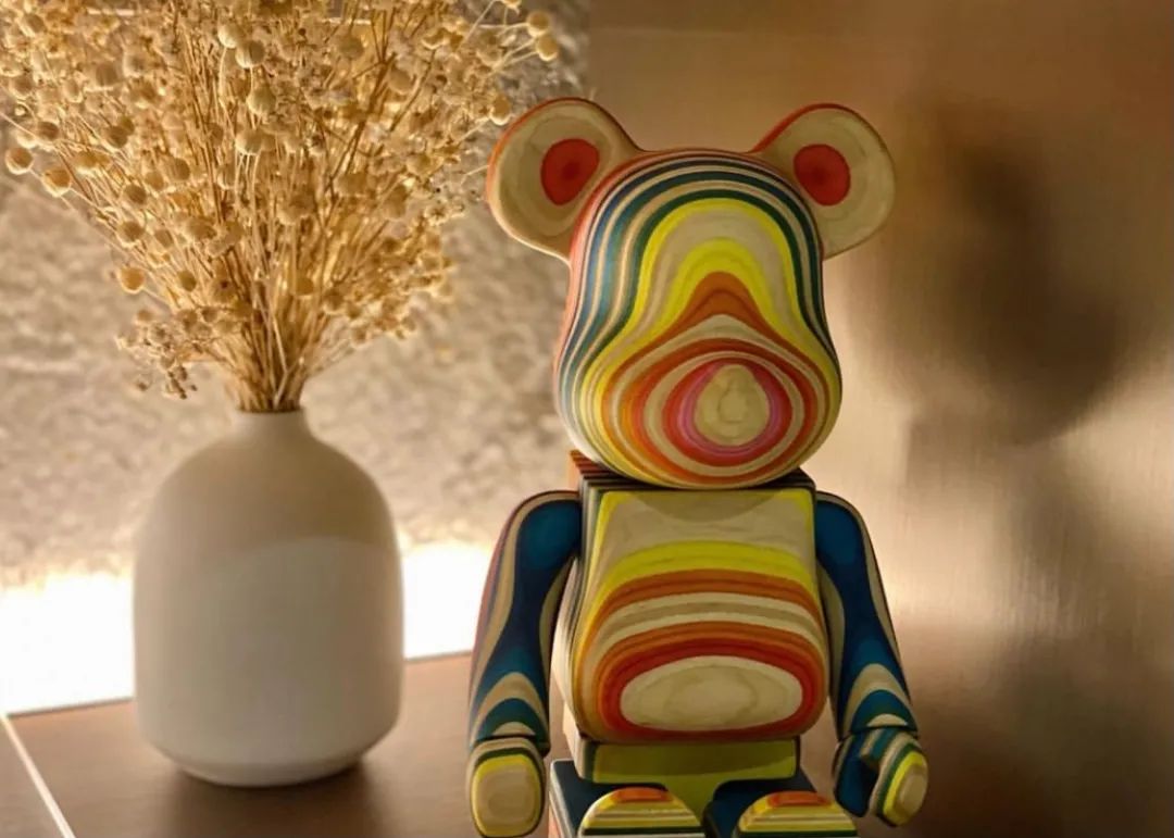 最贵的要数这只彩色积木熊了。它是2020年的新款,由日本雕塑家Haroshi 与玩具公司MEDICOM TOY共同设计,其中运用的木片拼花工艺是箱根地区的特产工艺,历史可以追溯到200多年以前。