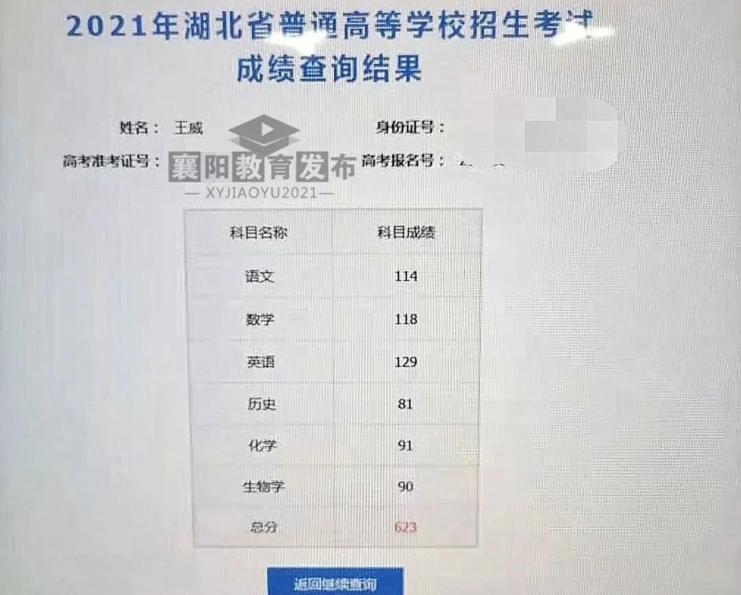 6月25日凌晨,王威到网吧查到了自己的高考成绩:语文114分,数学118分,英语129分,历史81分,化学91分,生物学90分,总分623分。