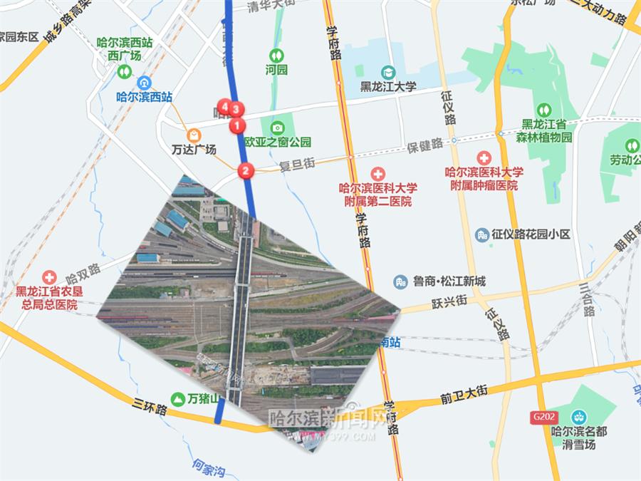 哈西大街打通工程位于南岗区,北起绥化路,跨越伊春路、哈南编组站,终接现状哈西大街,全长1321.261米,包括桥梁、道路、排水、绿化、照明、交通设施等内容。