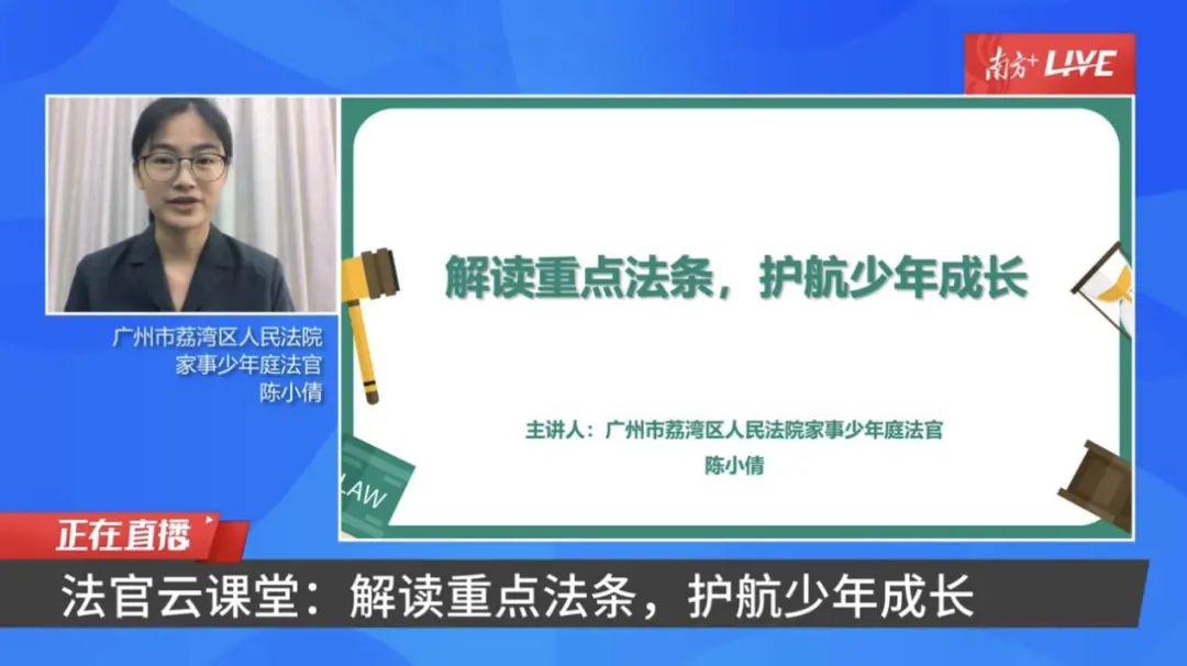 在班上被同学孤立,属于“校园欺凌”吗?父母离婚,孩子是否能主动选择跟谁生活?6月24日,荔湾区法院联合南方日报、南方+开展《如何护航少年健康成长?法官在线科普,一起来学法律小知识!》的“荔法云课堂”直播课,荔湾法院家事少年审判庭陈小倩法官为大家深入解读《民法典》《刑法》《未成年人保护法》中与未成年人权益保护密切相关的规定。