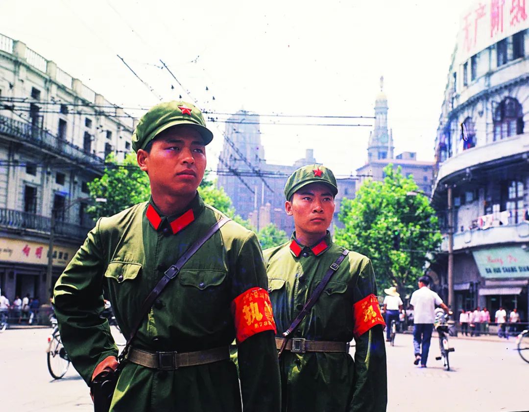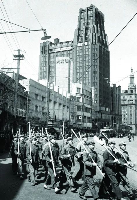 中国人民解放军某部八连于1949年五六月间进驻上海南京路,担负警卫、执勤任务,被人民群众誉为“霓虹灯下的哨兵”。图为在南京路上执勤的八连战士
