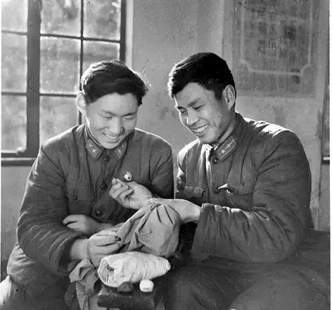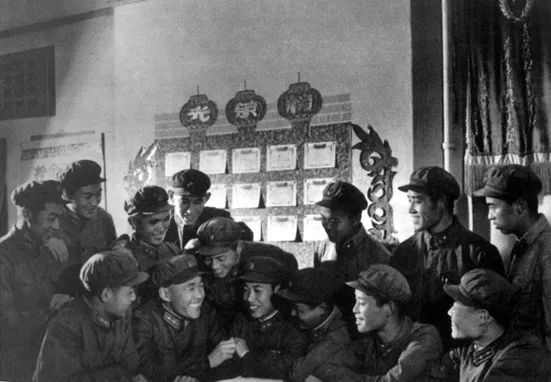 通过深入学习,八连战士逐渐意识到“拒腐蚀、永不沾”的重要性,决心保持艰苦朴素本色。他们坚持脚穿草鞋,肩扛铁锹,步行去郊区拓荒种菜。上图为八连战士们从郊区劳动完归来,下图为“好八连”指导员王经文(右)教战士补衣服
