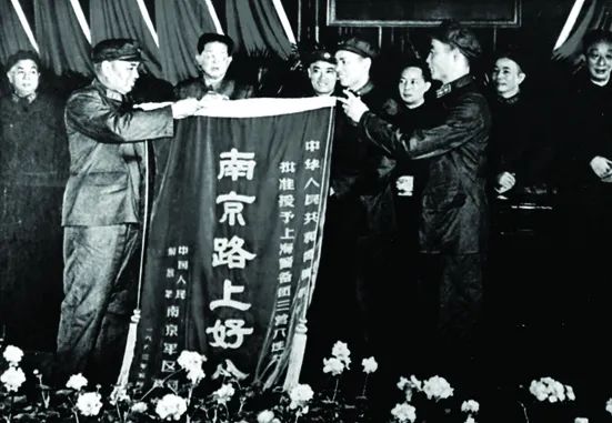 1963年5月5日,南京军区在上海隆重召开“南京路上好八连”命名大会。时任国防部副部长、南京军区司令员许世友将锦旗授给时任连长张继宝、指导员王经文。图为“南京路上好八连”授旗仪式