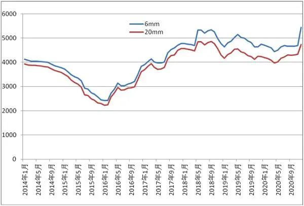 中国造船板月均价格走势(2014-2020),数据来源:中国钢铁协会