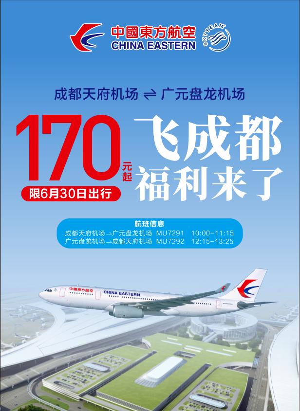 6月28日下午,记者从广元盘龙机场获悉,中国东方航空在该机场6月30日从广元直飞成都的航班,机票仅需170元起。