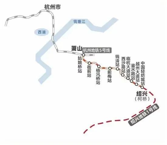 杭绍城际铁路起于杭州市萧山区姑娘桥站,与杭州地铁5号线叠岛换乘,终于绍兴市柯桥区笛扬路中国轻纺城站,与绍兴轨道交通1号线贯通运营,线路全长20.3公里,设站10 座。绍兴地铁1号线柯桥段设计最高速度100km/h。