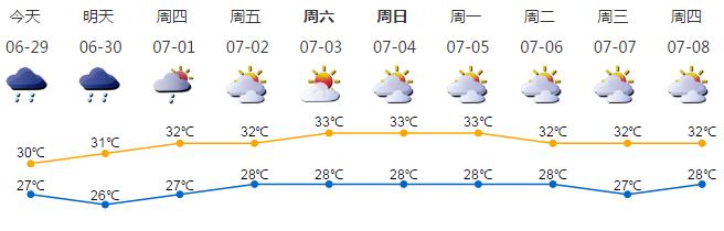 我市阴天,有(雷)阵雨,部分时间雨势较大;气温27-30℃;西南风3-4级,沿海、高地和海区最大阵风7级左右;相对湿度75%-100%。