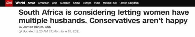 据美国有线电视新闻网(CNN) 28日报道,南非政府正考虑允许女性拥有多个丈夫,这一可能性让该国保守派人士哗然。目前一夫多妻制在南非是合法的。