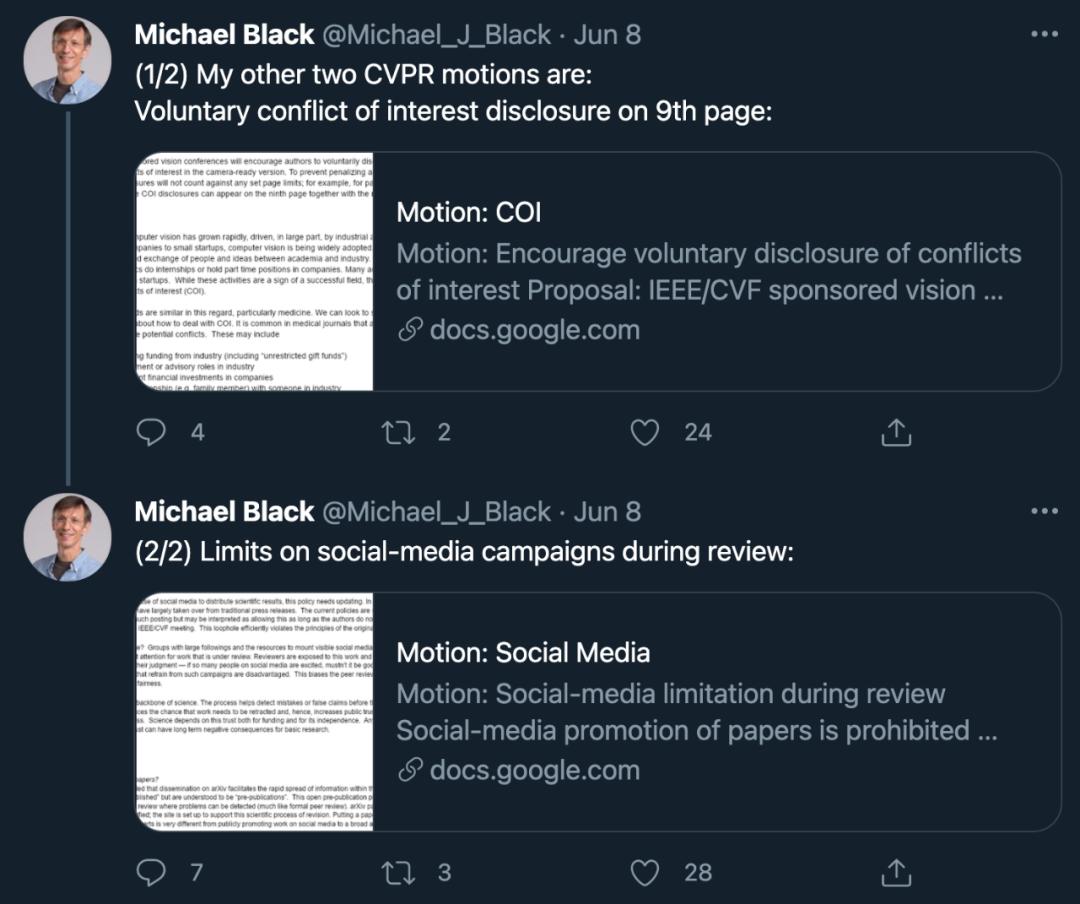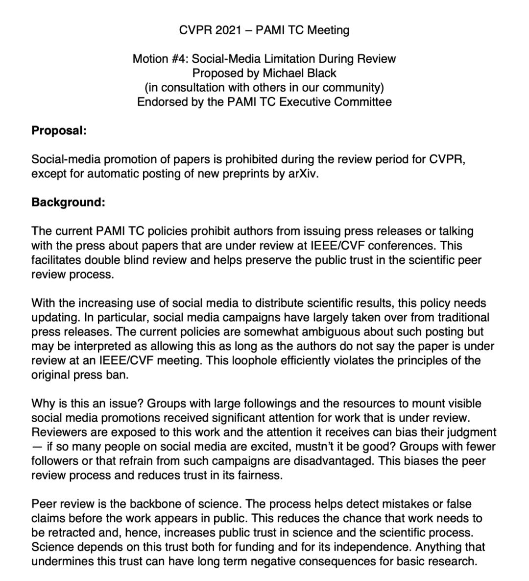 在近日召开的 CVPR 2021 PAMI TC 会议上,马普智能系统研究所所长 Michael Black 提出了一项动议:审稿期间禁止在社交媒体上宣传论文。在 arXiv 上自动发布的预印本论文除外。