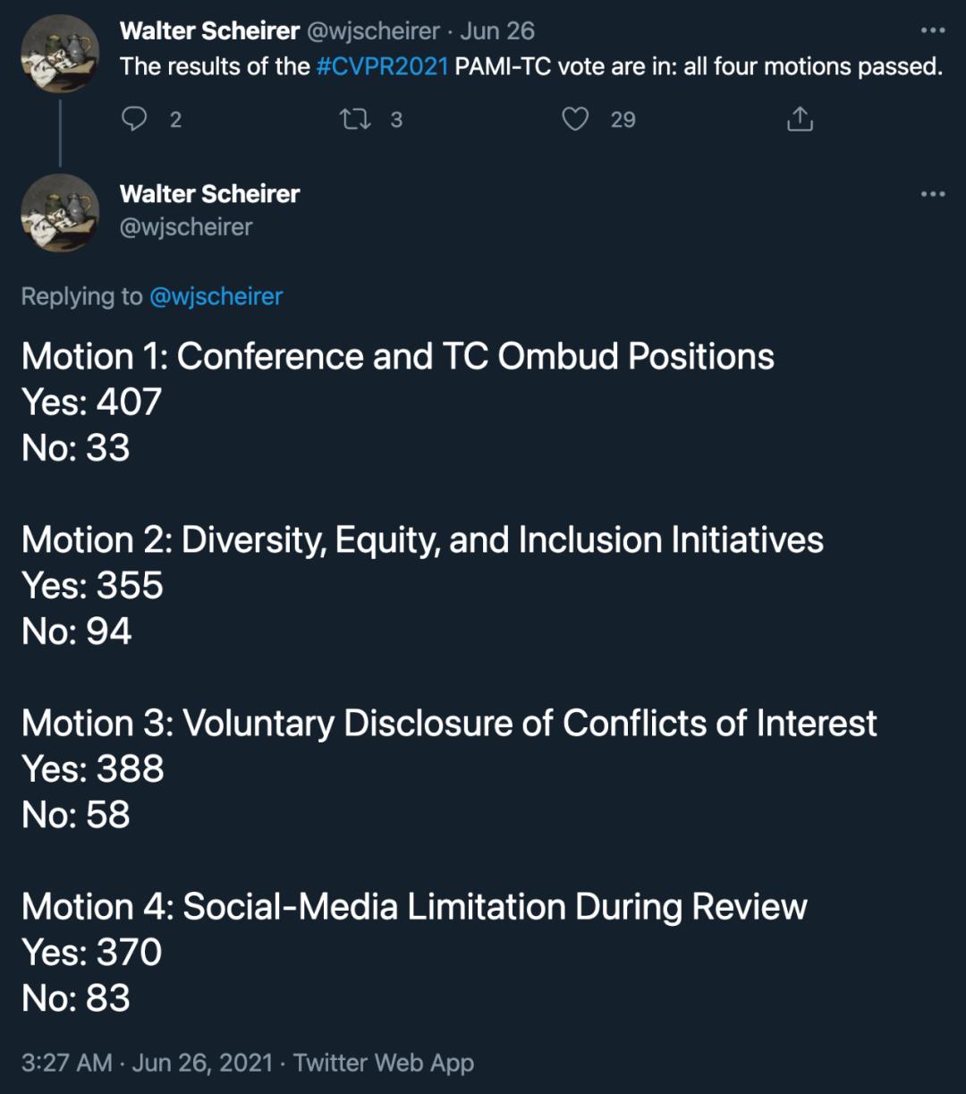 目前,这项动议已经以 370:83 的票数在 CVPR 2021 投票通过。