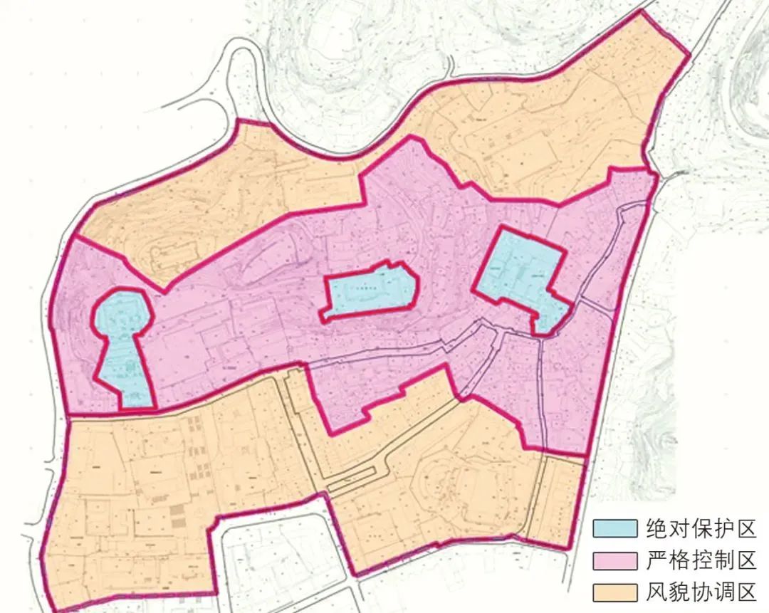 本次规划在以三处红色景区作为绝对保护区(5.26hm2)的基础上,将对“扎西会议”红色景区的保护开发扩展到周边街区的规划与建设中,将主要历史文化风貌尚存的上街、老街地段,设定为严格控制区(32.85hm2),这不仅是对绝对保护区周边环境整治的整体考虑,更是将以绝对保护区为核心的红色旅游与由周边历史街区体现的地方文化与民俗旅游相结合,为“扎西会议”历史街区的建设开发走出一条新路。而严格控制区外围传统特色与现代风貌混杂的部分地段,被设定为风貌协调区(46.13hm2),作为传统乡土风貌向现代城镇格局逐渐过渡的区域(图2)。