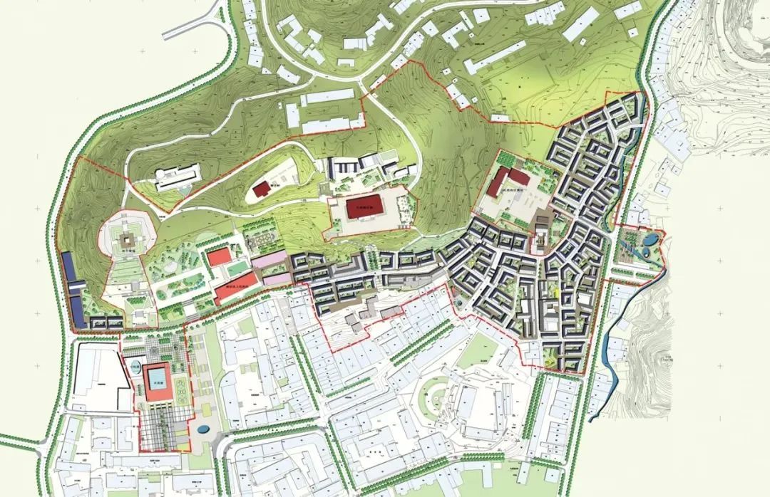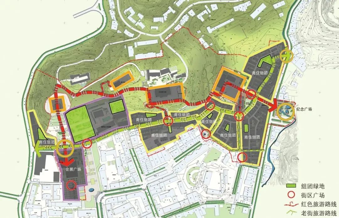 规划故而确立了将红色旅游和地方民俗旅游相结合的规划立意,反映在空间上即是通过对街区整体的空间整合,使核心的红色景区和外围步行街区在空间上交流融通,以红色景区游览需求的提升带动外围街区的开发建设,以外围街区的配套服务完善红色景区的整体品质。在具体的规划手法上,采用多种方式来促进景观游览路线和街区步行路线之间的融合沟通。