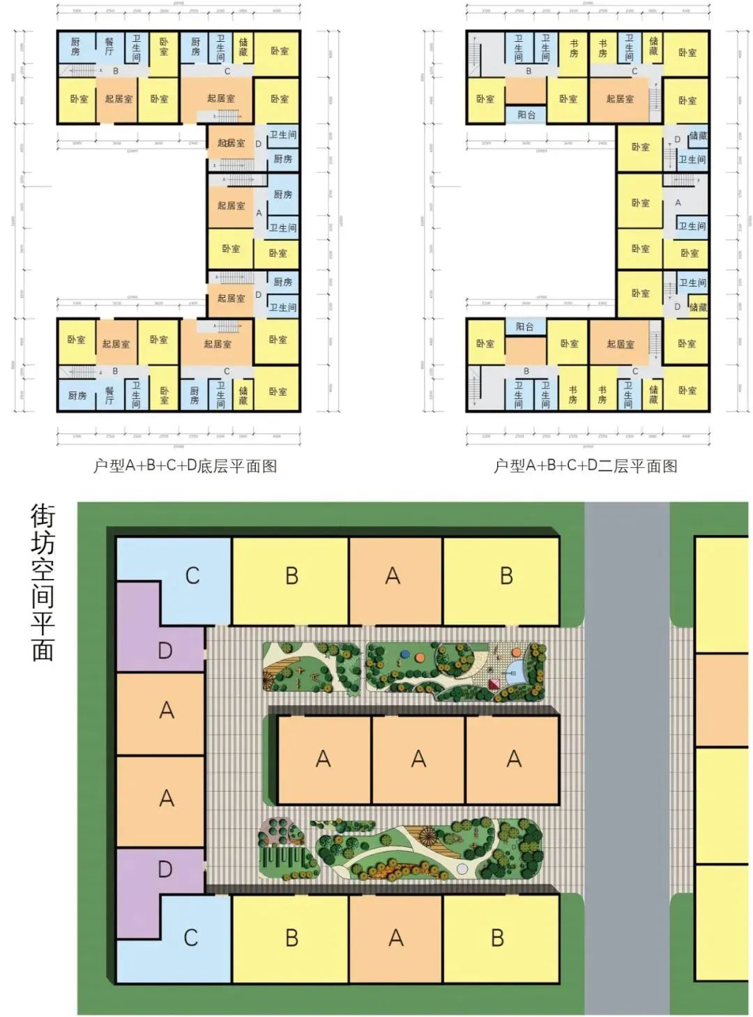街区空间肌理改造中一个重要的方面是对传统建筑肌理的改造。传统川南民居的平面布局已经不能完全适应现代生活的使用需求,因此规划在保留部分风貌和建筑质量完好的传统建筑的前提下,对需要进行较大程度更新的居住片区进行了探索性的建筑改造。规划预设了四种建筑平面,以满足居民选择和使用的需要,其共性在于首先将建筑进深由12~15m 缩减为8~10m,避免出现无直接采光的房间;其次,以2~3层为街区内居住建筑的主要高度,将原有集中在一个大屋顶下的各种功能分层布局,一方面使建筑内布局和流线更为清晰合理,符合现实的使用需求,另一方面结合山体丘陵走势,使街区更富有立体的起伏。并且,由于建筑进深的缩小,街坊内部原有的局促空间得以放大,从而可以在街坊中心布局少量住宅、街区服务中心或者街区广场、绿化等公共活动空间,大大提高了街坊内部的用地使用比例,减少了用地的浪费,避免了街坊内的活动死角(图6)。