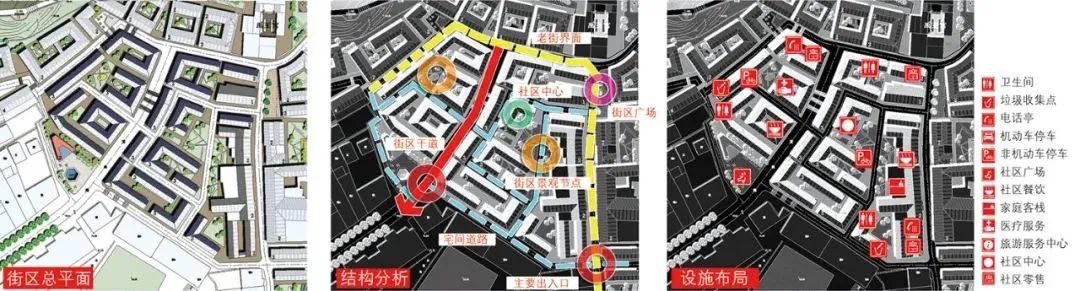 对空间肌理的改造更新,首先是保留原有以老街为空间联系轴线的主导肌理,保护老街传统的空间尺度和人行特征;在街区两侧入口外设立停车场,将机动车交通排除在街区以外,避免车行交通对传统肌理的破坏。同时,在老街与其他道路的节点处设立小型广场和绿化开敞空间,不但使老街街道空间更具层次和丰富感,也是重寻街道活力的重要举措。