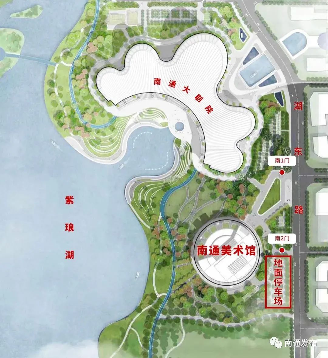 从通沪大道转入湖东路,由南2门进入南通美术馆停车场;